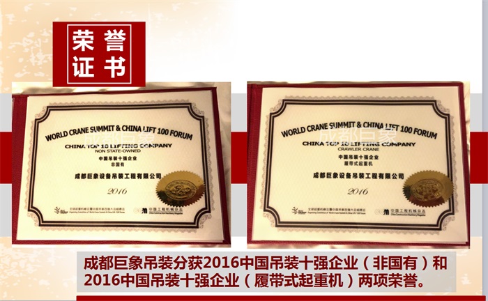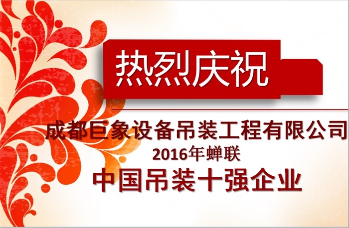 您的位置:首頁>新聞動態>熱烈祝賀成都巨象設備吊裝工程有限公司2016年蟬聯“中國吊裝十強企業”